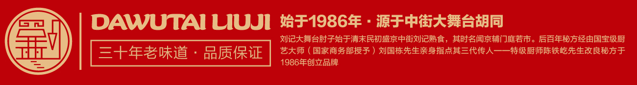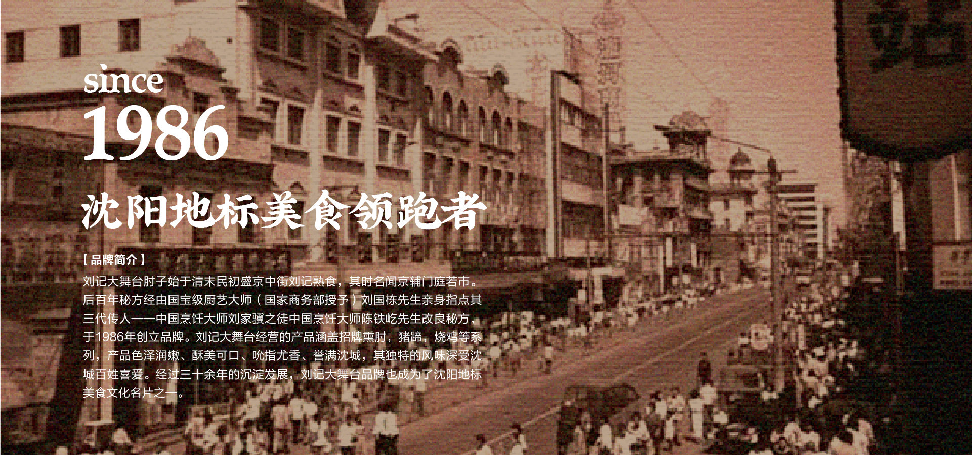 盛京,昔乃大清王朝發(fā)祥之地。劉記大舞臺肘子始于清末民初盛京中街劉記熟食,其時名聞京輔門庭若市。后百年秘方經由國寶級廚藝大師(國家商務部授予)劉國棟先生親身指點其三代傳人——中國烹飪大師劉家驥之徒中國烹飪大師陳鐵屹先生改良秘方,于1986年創(chuàng)立品牌。劉記大舞臺經營的產品涵蓋招牌熏肘,豬蹄,燒雞等系列,產品色澤潤嫩、酥美可口、吮指尤香、譽滿沈城,遂成古今絕味,其獨特的風味深受沈城百姓喜愛。經過三十余年的沉淀發(fā)展,劉記大舞臺品牌也成為了沈陽地標美食文化名片之一。